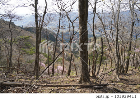 前仙人ケ岳から塩宮神社に向かう下山道から見る桐生市方面とアカヤシオ 2023年4月4日