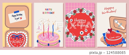 Cake birthday cards. Korean bento pastry, cute small sugar and fruits desserts in cute lunch boxes, holiday tea party sweets, party poster, cartoon flat style isolated tidy vector set
