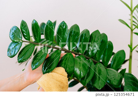 Zamiokulcas leaves stretching from dust, one long Zamiokulcas branch close-up in natural light . High quality photo