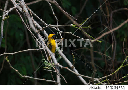 The yellow bird on Build nest from dry stick hay in nature