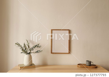 Home office concept. Empty horizontal wooden picture frame mockup. Cup of coffee on wooden table. White wall background. Vase with olive branches. Elegant working space. Scandinavian interior design.