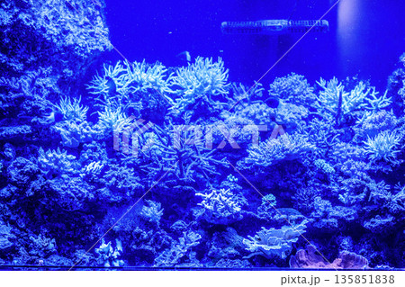 紫色のライトに照らされる水中の枝サンゴ