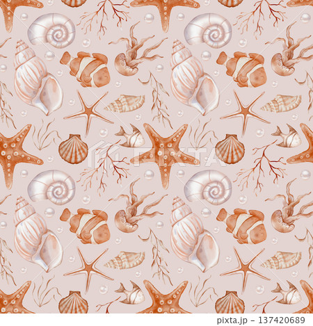 Orange beige sea seamless pattern with Seashell and Pearls and fishes on isolated background. Hand drawn vintage watercolor ornament with Seaweed and stars for print in nautical style.