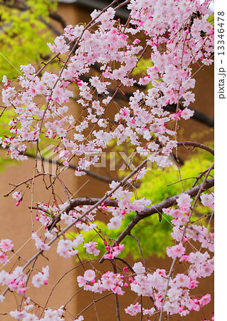 八重紅枝垂桜 ピンク色の桜の花 しだれ桜 花見 クローズアップ
