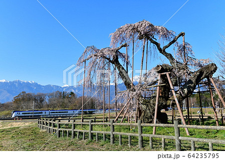 北杜市小淵沢町、神殿の大糸桜と中央本線を行くE353系特急あずさ、南アルプスの山々