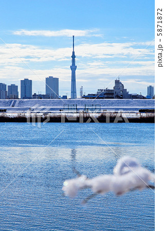 残雪の川原より東京スカイツリーと川の手住宅街を臨む