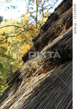 アイヌコタンにある、かやぶき屋根と紅葉の秋