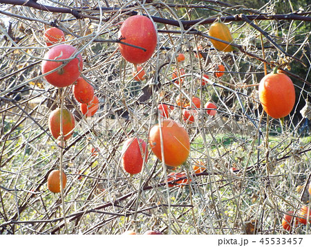 秋の枯野を彩るカラスウリの実