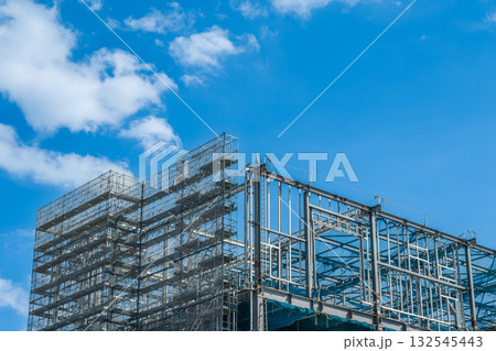 青空の建設現場 鉄骨建方工事