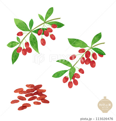 生薬のイラスト/ 枸杞の実と枝・乾燥した実