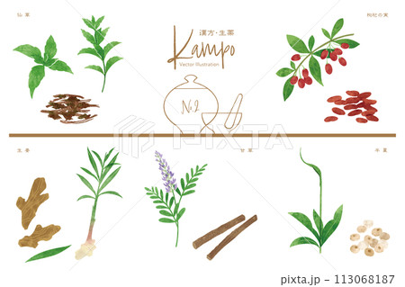 生薬ベクターイラストセット2(仙草・枸杞の実・生姜・甘草・半夏)