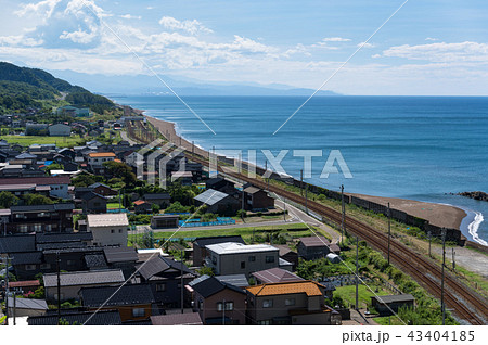 米山海水浴場と線路 新潟県 柏崎 米山展望広場