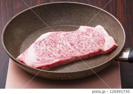フライパンで焼く牛肉 和牛ステーキ 霜降りステーキ肉 サーロインステーキ イメージ素材