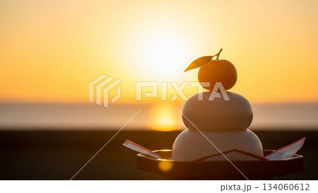海に沈む夕日を背景に置かれた鏡餅の美しいシルエット写真