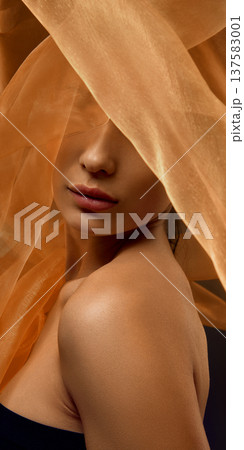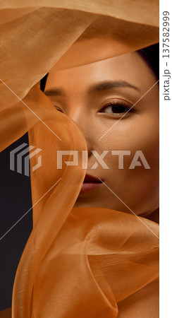 Beauty portrait of Asian woman framed by translucent golden silk fabric with flowing shapes