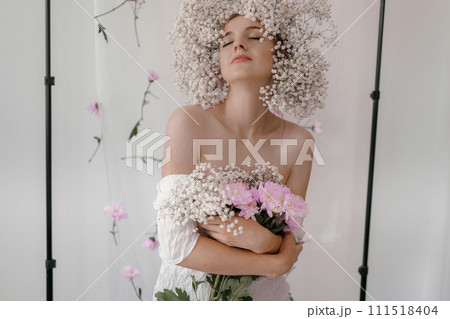 Portrait of sensual blond woman with flowers. Beautiful girl with flowers in her hair. Summer Beauty. Art in a contemporary style. A gypsophila wreath on a white background. Perfume, cosmetics concept