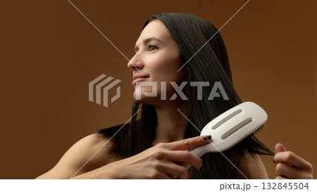 Woman brushing long straight hair with white detangling brush smiling calmly