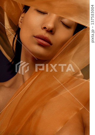 Serene beauty portrait of Asian woman with closed eyes wrapped in flowing golden silk fabric