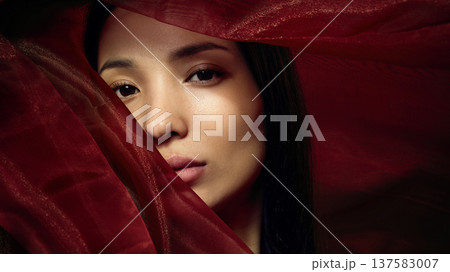 Beauty portrait of Korean woman partially covered with translucent red fabric, cinematic lighting
