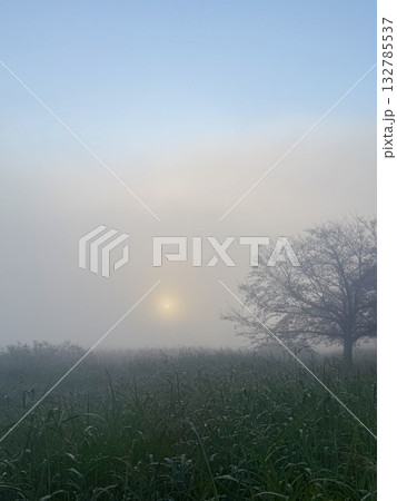 朝もやに包まれた草原と淡い朝日 / Misty Dawn over a Quiet Field