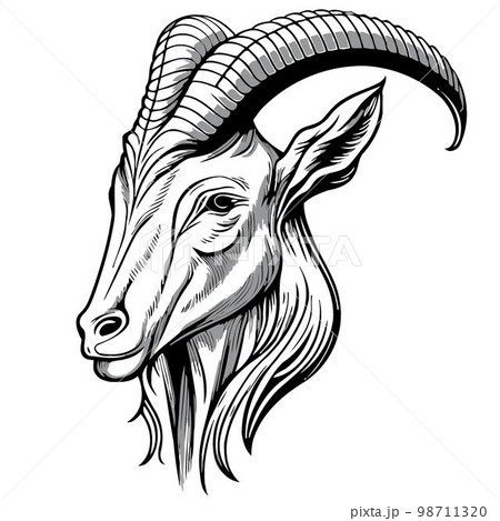 Large goat horns screwed shape from back, sketch vector drawing in graphic style on white background