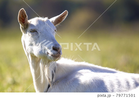 Portrait of white goat with beard on blurred bokeh background. Farming of useful animals concept.