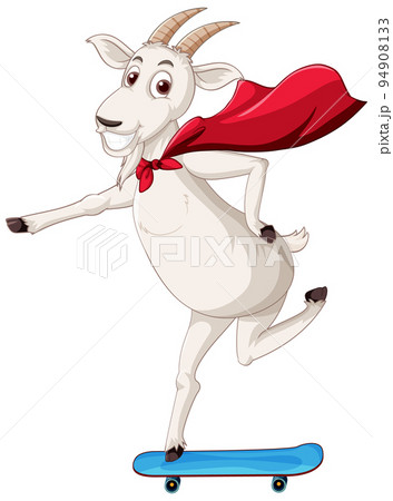 Watercolor illustration of a sitting black spotted goat wearing a red and white striped scarf