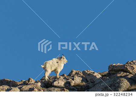 The mountain goat Oreamnos americanus lying on the rock, also known as the Rocky Mountain goat, is a hoofed mammal endemic to mountainous areas