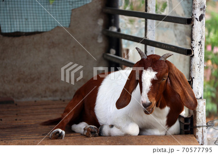 Goats from selected breeds livestock are placed in the cages to sell to breeders.