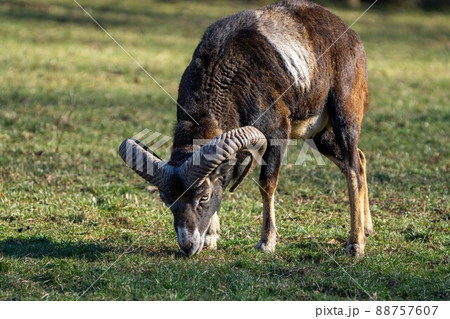 Baby european mouflon goat eats a carrot, omestic sheep in the afternoon close-up