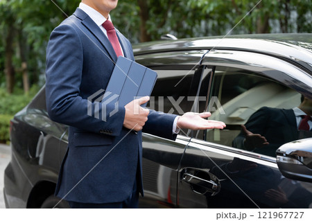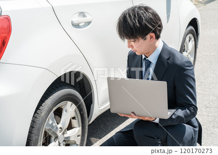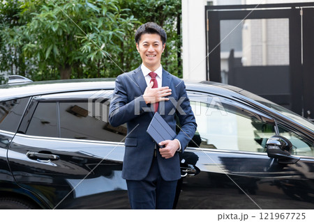 中古車を査定する営業マン・中古車査定士のスーツ姿の若いアジア人男性