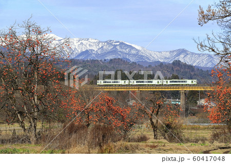 晩秋の磐越西線と雪化粧の飯豊連峰
