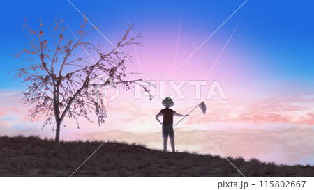 夕暮れ時に昆虫採集する少年 文字入れ用背景素材