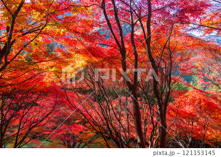 埼玉県秩父市大滝 栃本地域の秩父往還沿いの真っ赤に紅葉したモミジ群生 鮮やかな逆光の景色