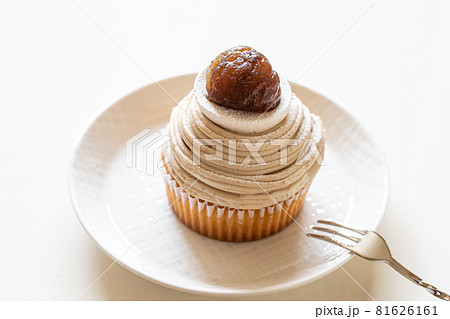 黄色い甘栗の乗ったカップケーキサイズの市販のモンブラン フォークを添えて