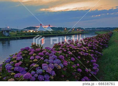 夕暮れの道の駅 多古あじさい館のアジサイ
