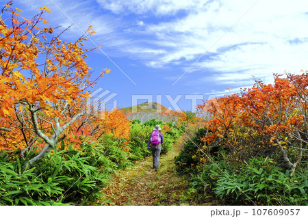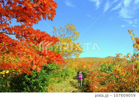 紅葉の栗駒山と女性ハイカー