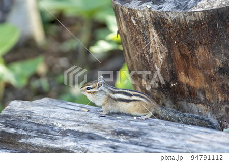 切り株の上で餌を食べるエゾリス