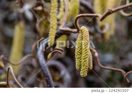 Twisted hazel tree with wavy branches, corylus avellana contorta