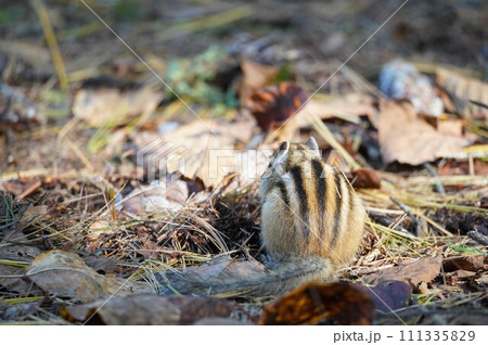 落ち葉の中でたたずむエゾリス