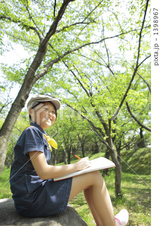 横顔の女学生イラストのカラー、新緑背景、人物中央