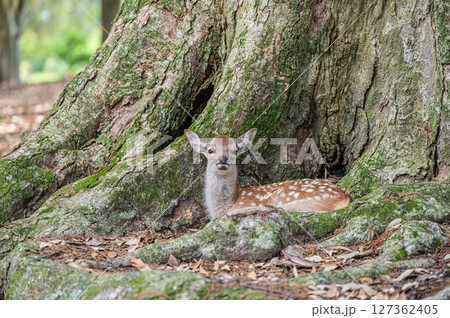 大木の根元でくつろぐ子鹿 奈良市奈良公園