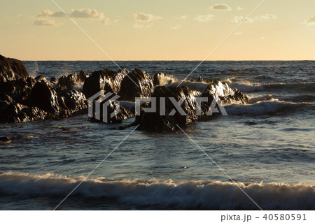 夕日に照らされる奇岩群 白浜の屏風岩 根本海岸 千葉県南房総市