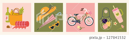 Square summer compositions with picnic basket, straw hat, sunglasses, umbrella, bicycle with flowers, fruit bag and reusable drink cup. Trendy modern vector illustration, hand drawn, flat design
