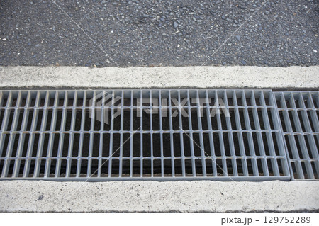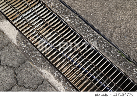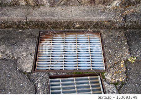 排水溝に設置された鉄製グレーチングの格子状パターン