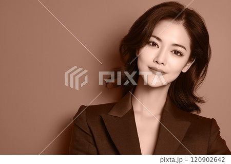 Mocha mousse brown portrait of a woman with sleek hair in a contemporary setting. Modern trendy tone hue shade