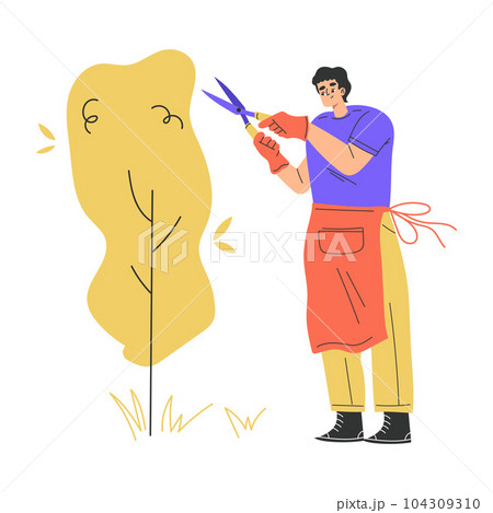 Man Gardener Character Cutting Bush with Pruner Vector Illustration