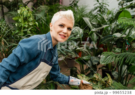 Take good care houseplants. Girl hold plant in pot. Floral shop.
