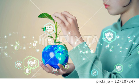 植物の生えた地球を持つ女の子 環境コンセプトビジュアル