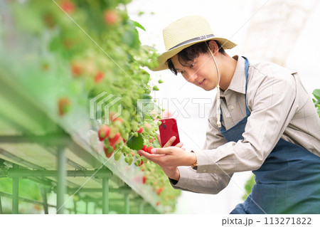 ビニールハウスにて苺にスマホを向ける若い農夫